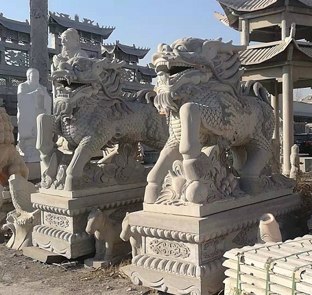 石雕麒麟在我國有著極端特殊的位置,在麒麟雕刻中,常常呈現石雕麒麟的身影,其作用便是護法辟邪鎮宅。石雕麒麟既然作為佛教圣物,那么當然也要被注重,因此人們就在門口擺放石雕麒麟。